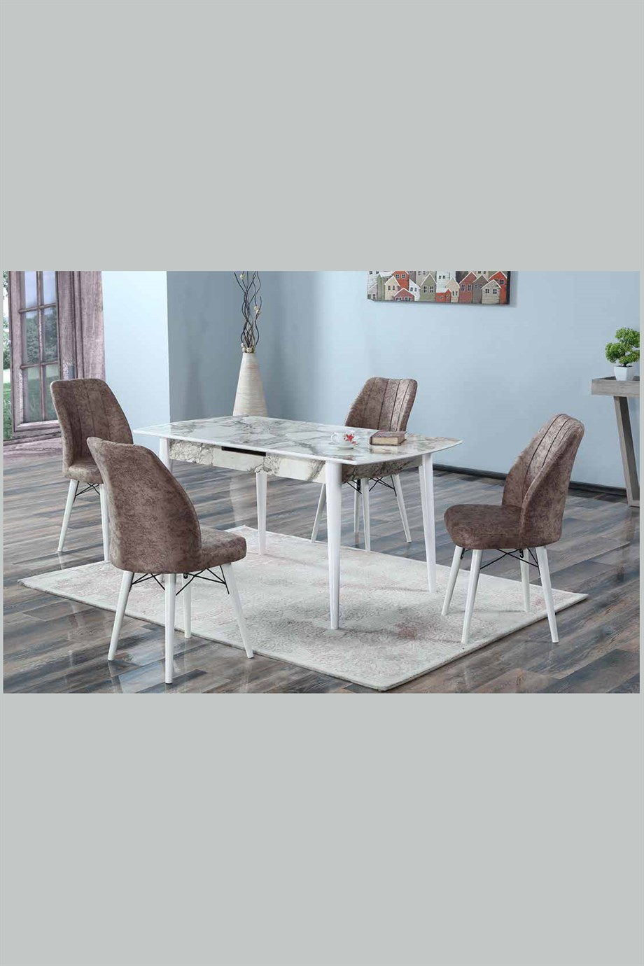 Krem Mermer Görünümlü Lam Masa Tablası,Ayaklar Beyaz Olarak Üretilmiştir.